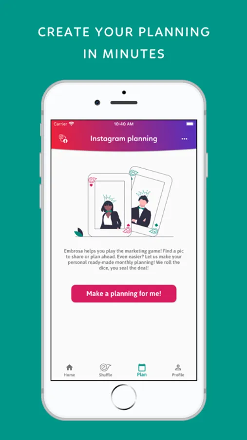 You can download visuals, save favorites, share directly to your Facebook and Instagram. Or, you can plan ahead to post at a later date. Looking for something even better? Look no more: you’ll receive a monthly ready-made Facebook- and Instagram planning that you easily personalize to your liking, and to your audience. Each planning is unique, based on the preferences in your personal profile. Experience the marketing power of great visuals combined with personalized posts!