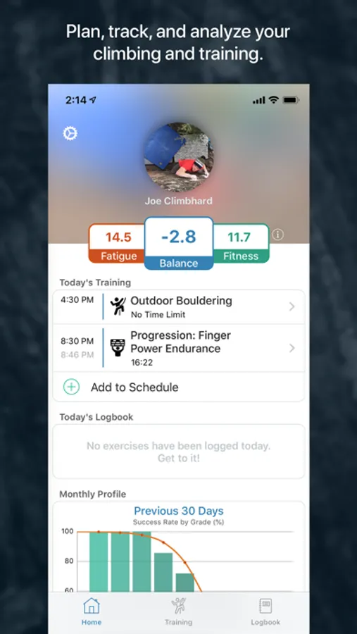 With Gneiss, it's easy to create, schedule, track, and manage your training all with one application. When you complete a workout with Gneiss, all the relevant information is automatically saved, analyzed, and presented in a way that makes tracking and optimizing your training a breeze. Focus on climbing, not maintaining a notebook.