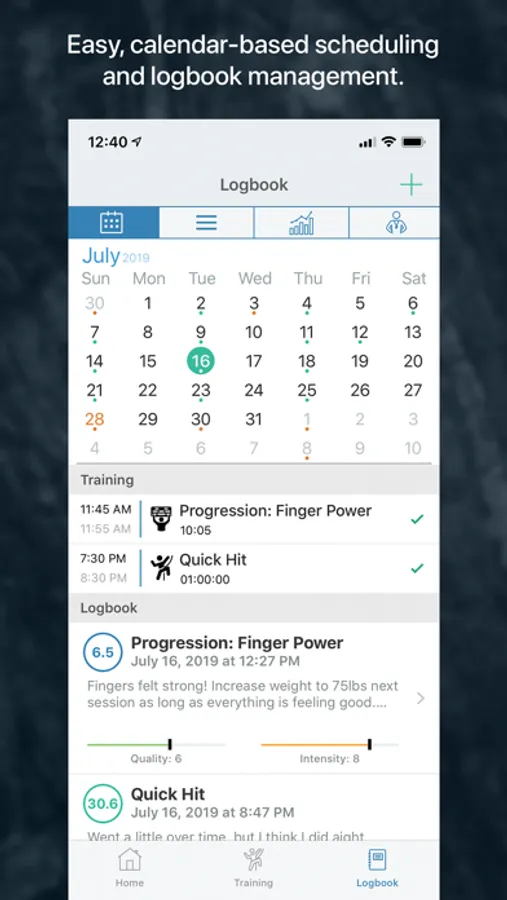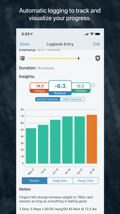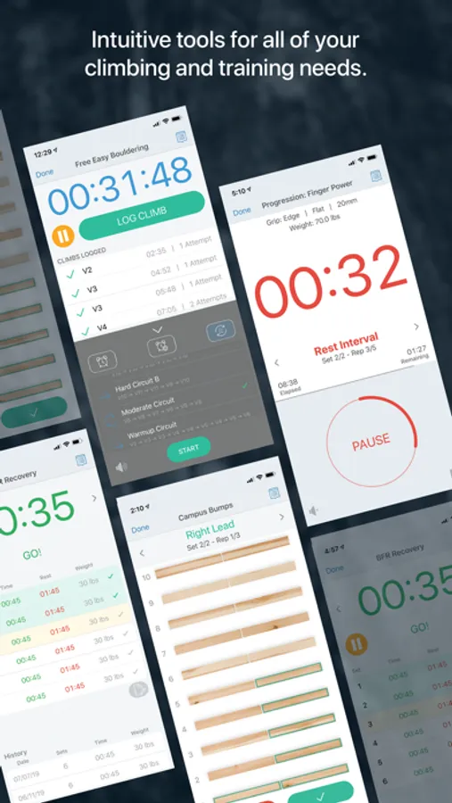• Intuitive interfaces to track climbing, hangboard, campus board, and strength training exercises.