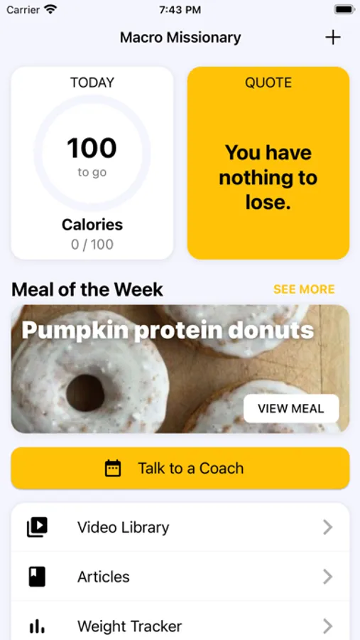 Your one stop shop for macronutrient tracking and food tracking. Built in recipes, instructional videos for learning and educating yourself on hot topics in health, huge food database and a weekly tracker to keep you on point when life happens. It all here for you!