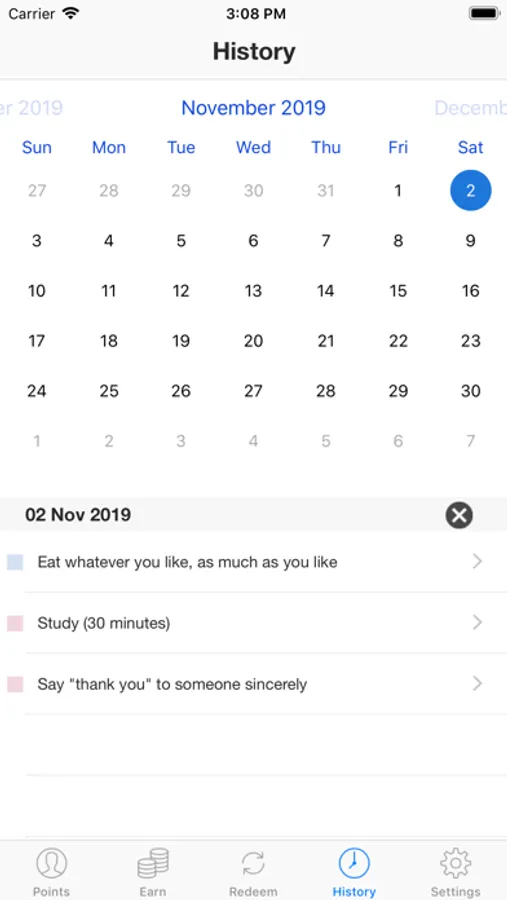 Check out your points history through the in-app calendar. Boost your motivation by checking your history when you've gotten bored of the activity. Have a look at all of your past efforts.