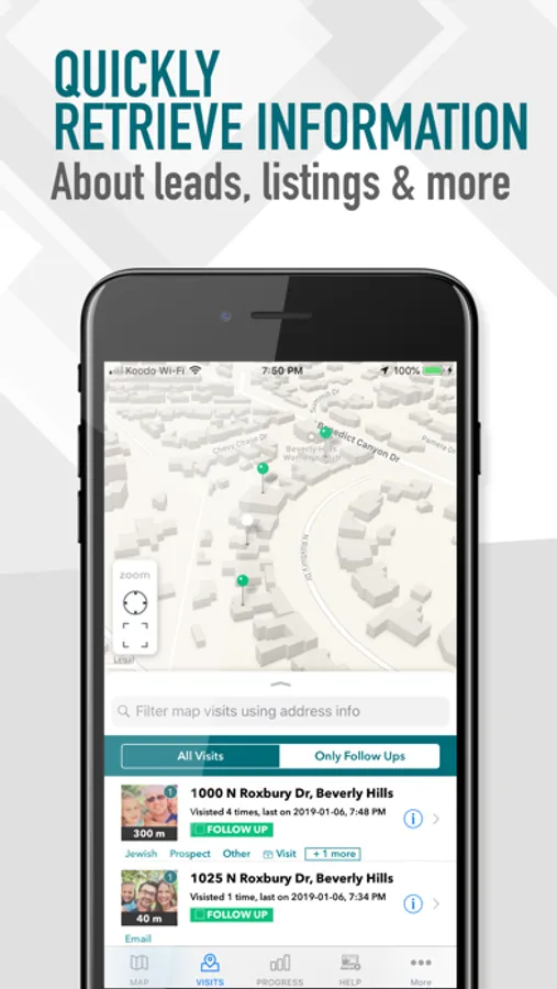 When you’ve visited a house you can apply one of three markers: Not Home, Not Interested and Follow Up. You can search the map using filters and view every scheduled follow-up activity in the area, making cold prospecting and following up as efficient as possible. If you’re heading to a follow-up visit, check the research section to see the history and information regarding your last visit.