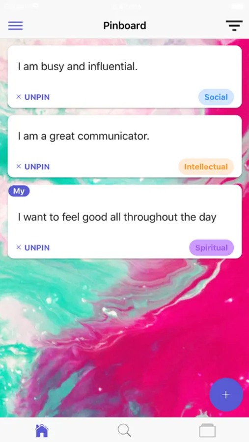 An app to keep you in a positive mindset. Open the app and read the positive affirmations that are loaded in by default. Or create your own. Stay positive. Change the world. Pin affirmations to your app pin board so you can glance at them whenever you want, preferably first thing in the morning, before you sleep and as many times as you wish in between.
