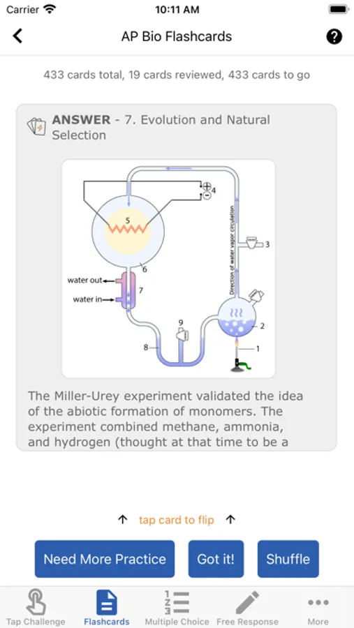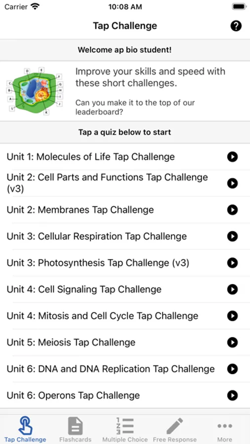 Biomania lets you interact with over a dozen tap-on diagram challenges, over 400 Flashcards, over 250 interactive multiple-choice questions, and over 100 free response questions. The questions cover all eight units in the College Board's AP Biology Curriculum. We use cognitive science methods (feedback and spaced retrieval learning) to ensure that your time with Biomania leads to learning and achievement.