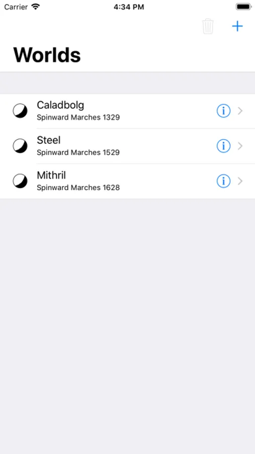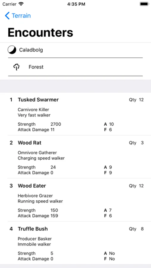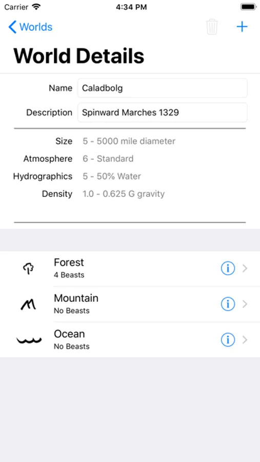 The app includes a list of worlds which are saved and restored automatically, terrain views for each world, and beast descriptions and animal encounter tables for each terrain/world combo.