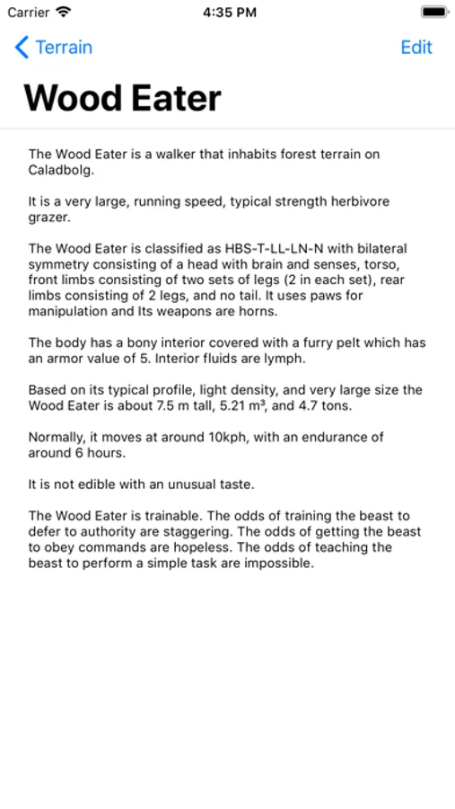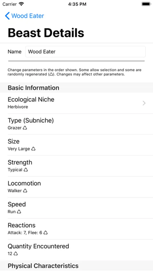 Beasts are created randomly based on the characteristics of the world and terrain type according to the rules, but may then be edited within those constraints to customize the design.