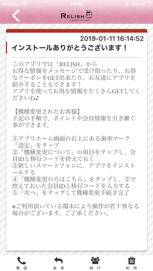 このアプリでは、RELISHの最新情報の受け取りや便利な機能を使う事ができます。