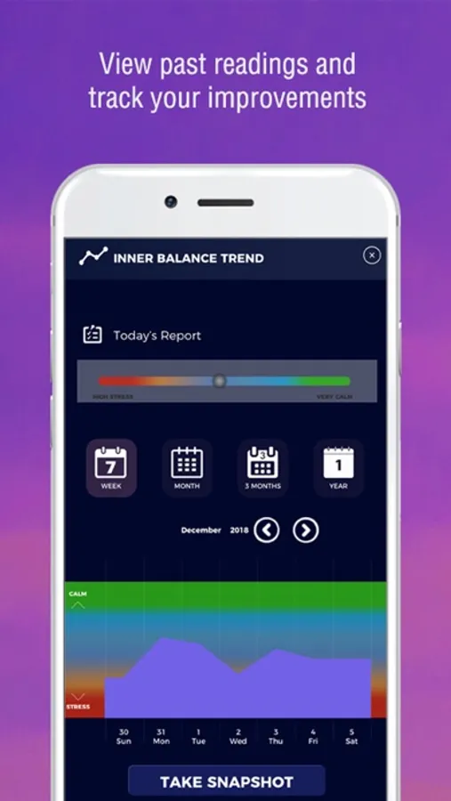 MONITOR – View past readings and track improvements. Easily navigate through charts and graphs to view and compare your stress vs. calm levels. Filter results by day, week, month, and year.