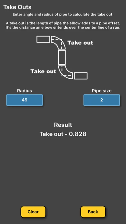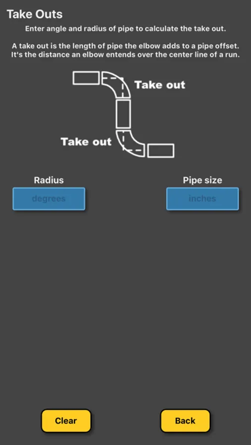 This calculator allows you to calculate the take-out required by entering the radius and the pipe diameter (in inches).