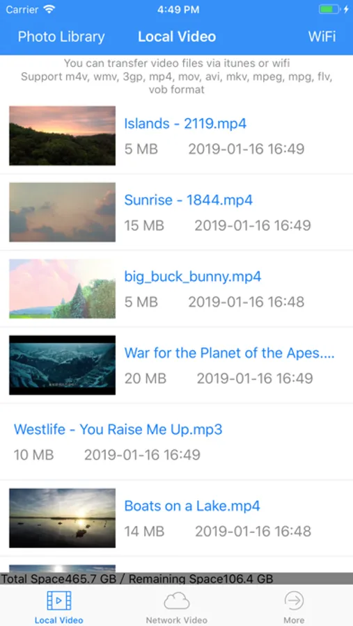 You can transfer video files via itunes or wifi