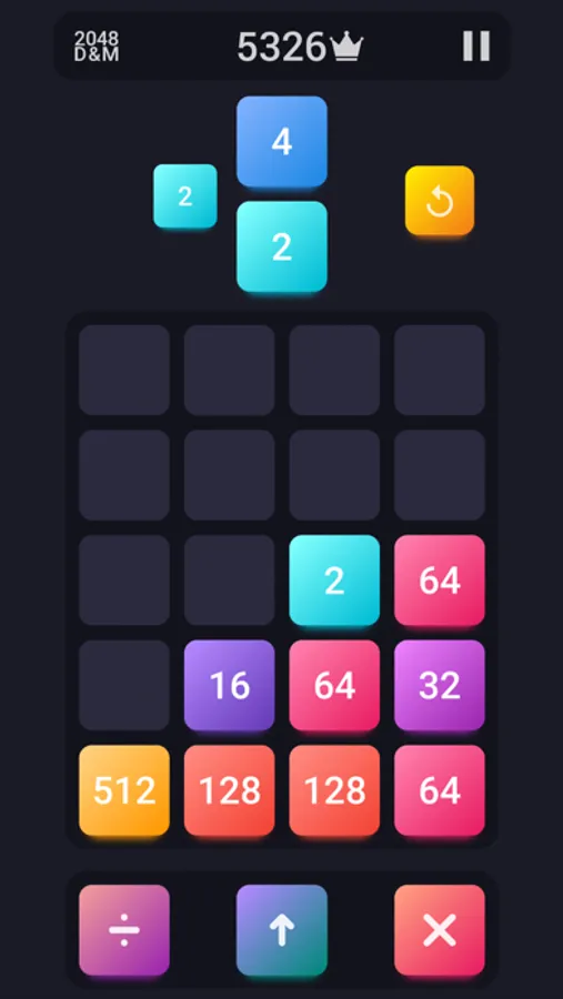 The game field consists of four columns with five cells each. Touch the empty cells to throw a tile in the column. Tiles will fall to the bottom or until they collide with other tiles. Tiles with two identical numbers will be merged into one tile with a double number. In 2048 game mode you can pick up the topmost tiles in the columns and move them to another column, but not more than one tile at a time. When you pick up the topmost tile, it moves to the tile dispenser and becomes the current tile along with the one that is there at that moment. When there are two current tiles in the dispenser, the lower tile will fall into the column you touch, and the upper tile into another column, if possible. In 2048+ mode, you cannot pick up the top tiles by touching them. In 2048+ mode, adjacent identical tiles will merge not only vertically, but also horizontally.