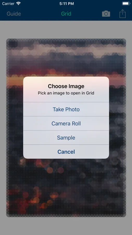 ● Open an image (you can use the camera roll, take a new photo or choose from samples) via the camera button