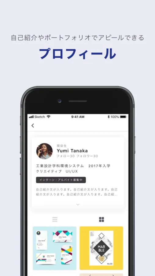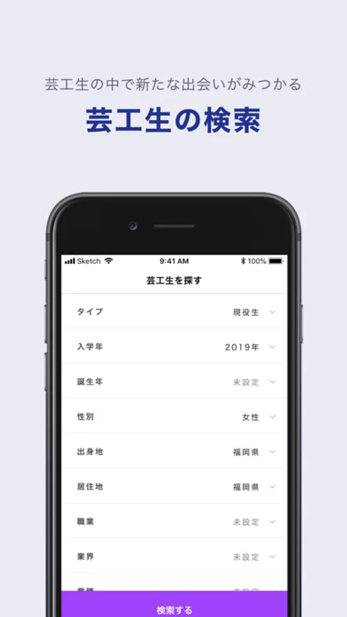 現役生は芸工アプリで卒業学科や業種を検索し新たな出会いはもちろん、サークル活動や研究、起業などに関する相談をOBに投げてアドバイスをもらうことができます。ポートフォリオを作成することで、活動のチャンスも広がります。