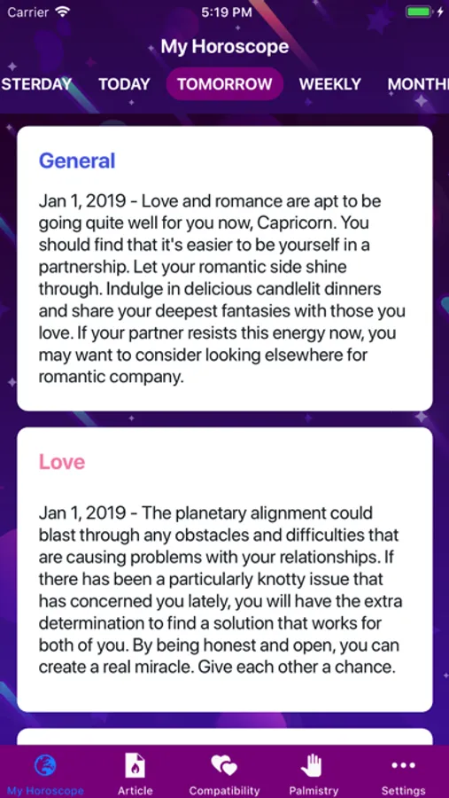 Discover what the future holds for you. Get an insight on what to expect for love, work, health and good fortune for today, tomorrow, the month or in 2020 with free daily horoscopes app. Follow your zodiac sign and observe horoscopes of friends and people you loved.