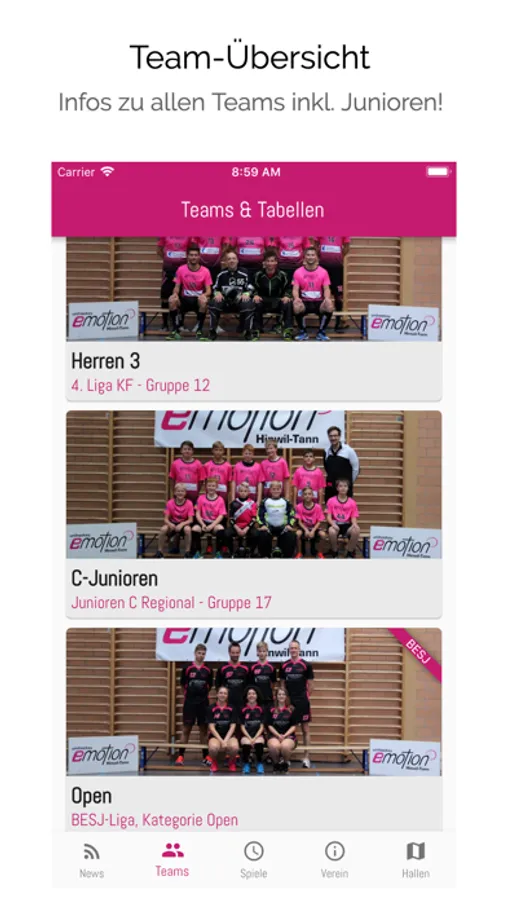 Die topaktuelle, eigens für den Verein entwickelte App von Unihockey emotion Hinwil-Tann liefert Vereinsmitgliedern, Fans und Interessierten alle nötigen Informationen rund um den pinken Unihockey-Verein. Teamübersichten (inkl. BESJ-Teams), Resultate, Tabellen, Vereins-Newsletter - alles praktisch an einem Ort vereint.