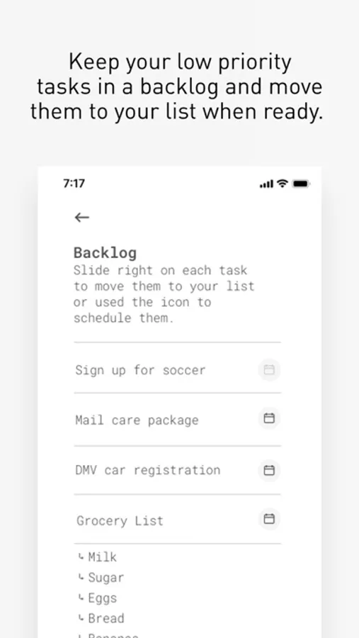 Save low priority tasks here. Swipe to add them to today's list or schedule them and they will show up on the day you set.