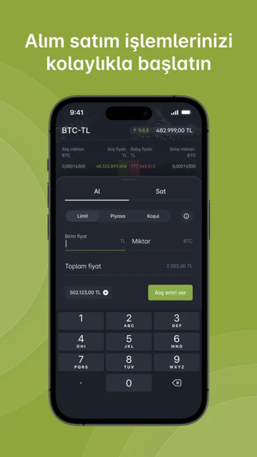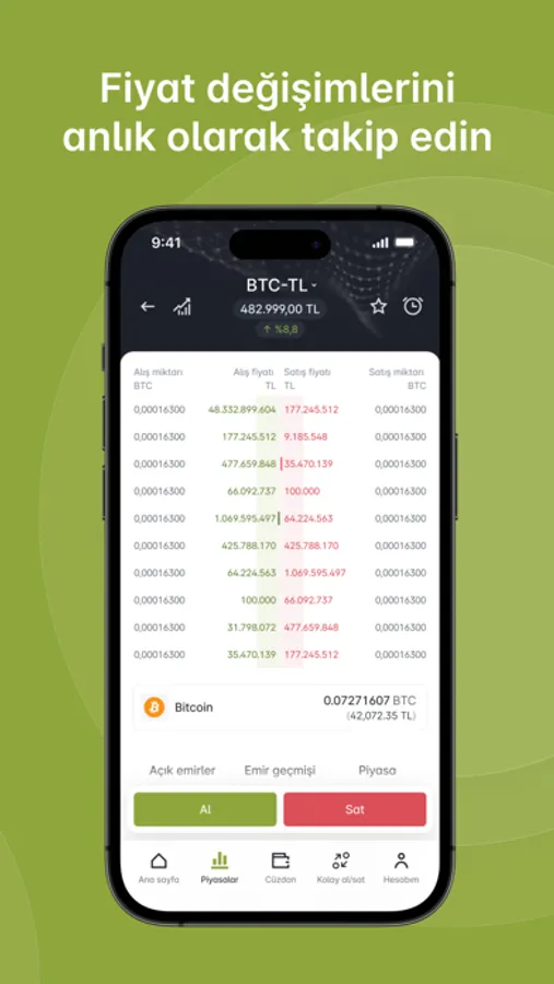 The "easy buy&sell" feature allows you to perform cryptocurrency transactions instantly. Go to market details, choose limit or stop loss order, and execute your transaction. You can see your open orders, your order history, and all orders in the market in one place. Thanks to the advanced chart display feature, you can also analyze market price movements detailedly.