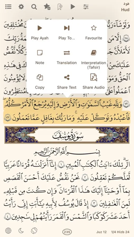 • Verse-by-verse audio recitation by multiple reciters (Abdulbasit, Al-Minshawi, Maytham Al-Tammar,...)