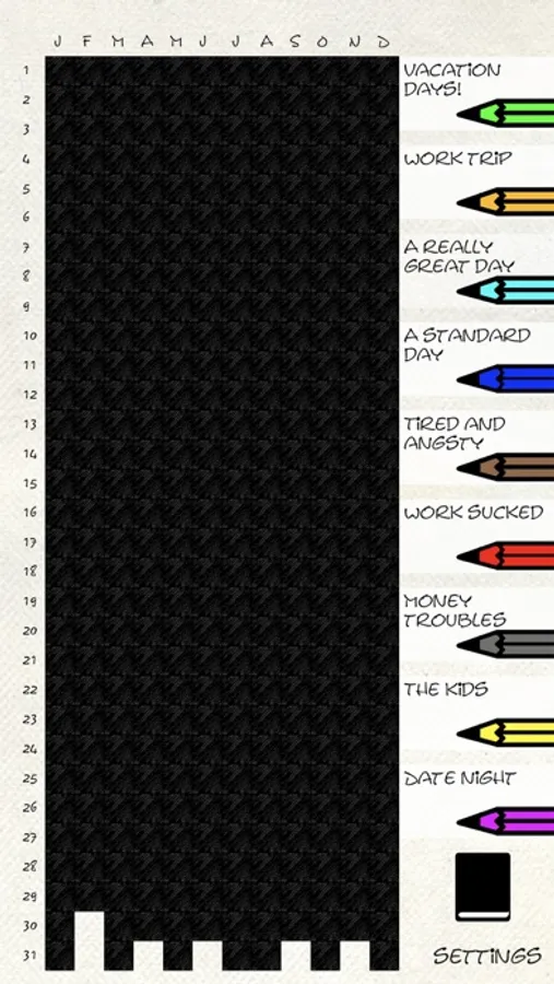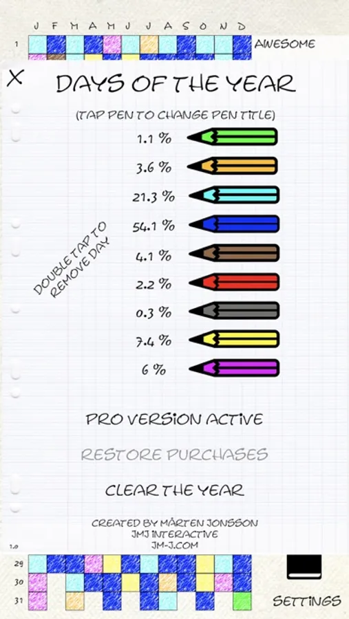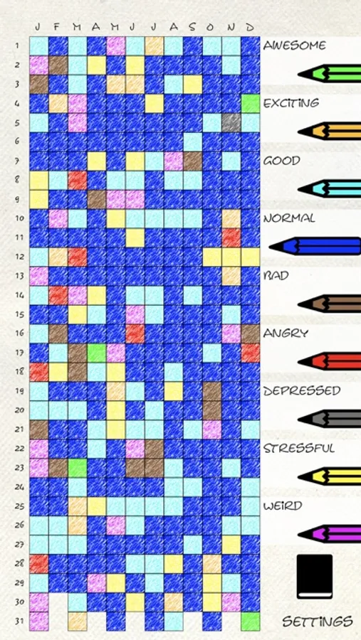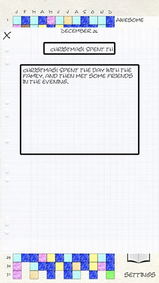 Days of the Year gives an easy, quick way to get an overview over how you are doing, over a year. Each day, summarize your impressions and over time a colorful summary will emerge. Take care of yourself, think about how you feel.