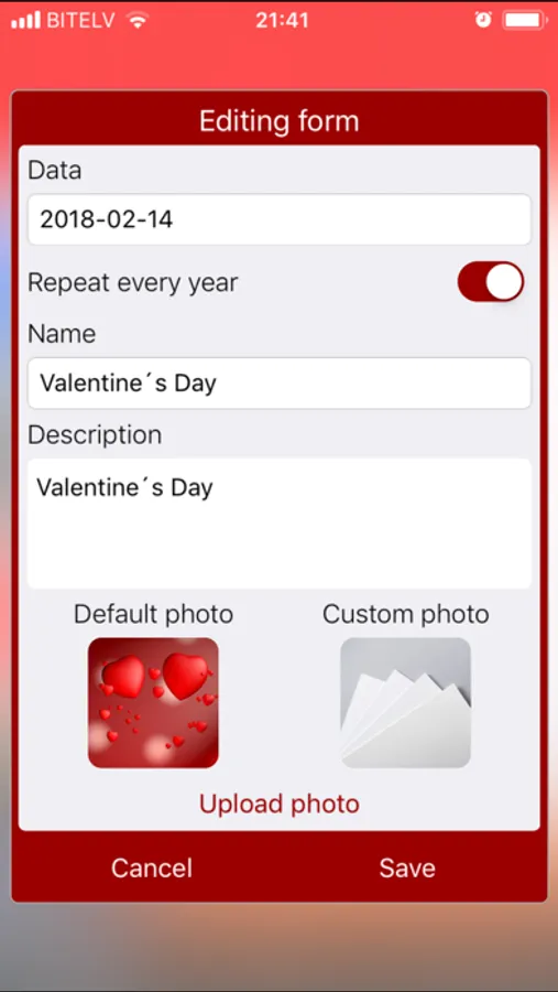 You can set the local notification time and day according to your needs and you can add your own events also. App is fully integrated with phone contacts.