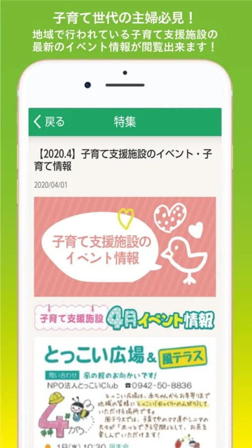 3、子育て世代の主婦必見!地域で行われている子育て支援施設の最新のイベント情報が閲覧出来ます!