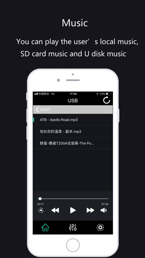 Music:You can play the user’s local music,SD card music and U disk music;