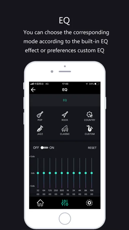 EQ:You can choose the corresponding mode according to the built-in EQ effect or preferences custom EQ;