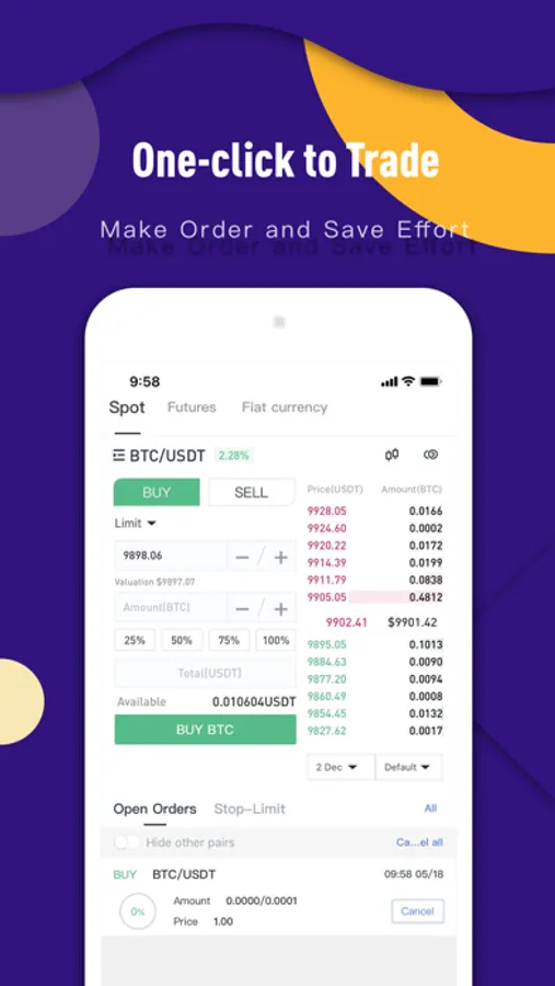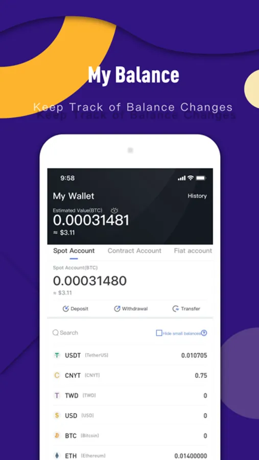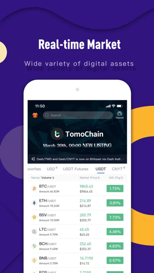 BitAsset supports a variety of legal currency deposits such as RMB, USD, and Taiwan dollar, and provides a variety of professional digital asset trading products such as spot and futures, so that you can easily achieve multiple types of trading claims without switching.