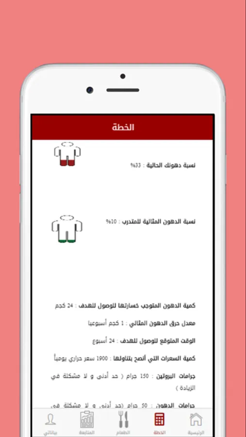 في التطبيق ستدخل بياناتك و ستظهر لك الخطة التي سوف تسير عليها، من حيث: