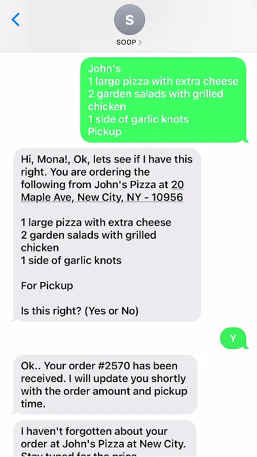 Simplify your takeout and delivery orders with SOOP! SOOP revolutionizes the way customers place take-out and delivery orders while streamlining your order management process, allowing you to focus on servicing your customers and growing your business. Customers simply use the platforms they are already familiar with, like text messaging, to place their pickup or delivery orders with a restaurant. The order will queue up in a simple to use tablet screen at the restaurant for easy online order management. SOOP also provides analytics to allow the restaurant to monitor their online order statistics.