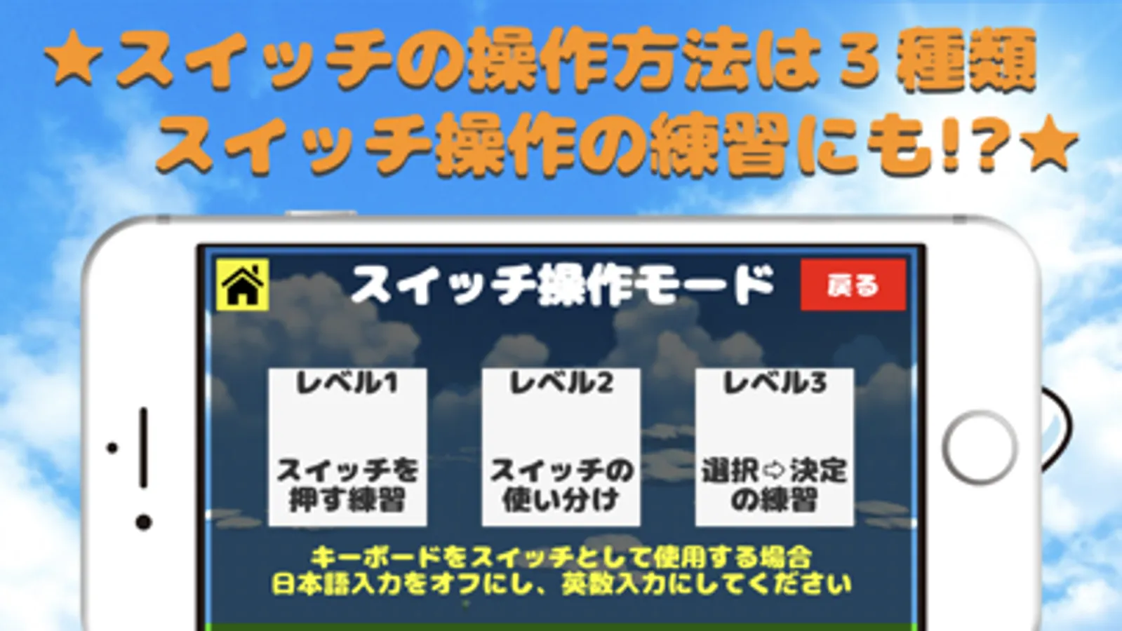 ・スイッチの練習として使えるよう、操作方法をレベル1〜3の3段階から選べる!
