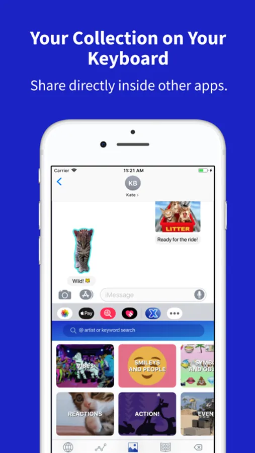 Select - from 1,000,000+ Gifs and Stickers that match your individuality, interests, and style in our ever-expanding database. Come check out what talented artists are creating that will bring your messages to the next level. Search directly from the keyboard or inside the app.