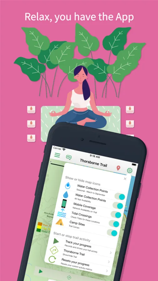 The app provides the hiker with both an on and off-line accessible topological Island map. This map can be zoomed and panned to show different perspectives of the trail and a satellite view is available when on-line. The map provides key trail-specific GPS generated features. These include the actual trail itself and useful metrics such as the distance walked so far, distance to the nearest water source and camp site. The app also provides a selectable set of icons that mark key locations on the trail for all season water sources, hiking season water sources, tidal creeks and locations for limited cellular access and also campsites. The hikers exact positional latitude and longitude is also provided by the map should that information be needed. The information provided by the app is a distillation of local knowledge some of which cannot be found anywhere else.