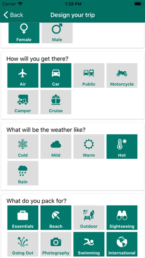 No matter what's the climate of your destination, PackKing tells you what to pack. Cold, Mild, Warm Hot or Rainy climate, PackKing has it all.