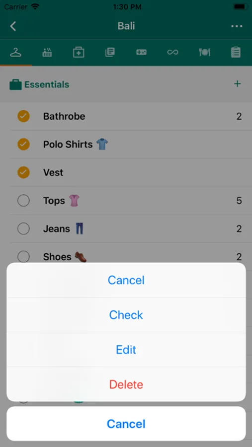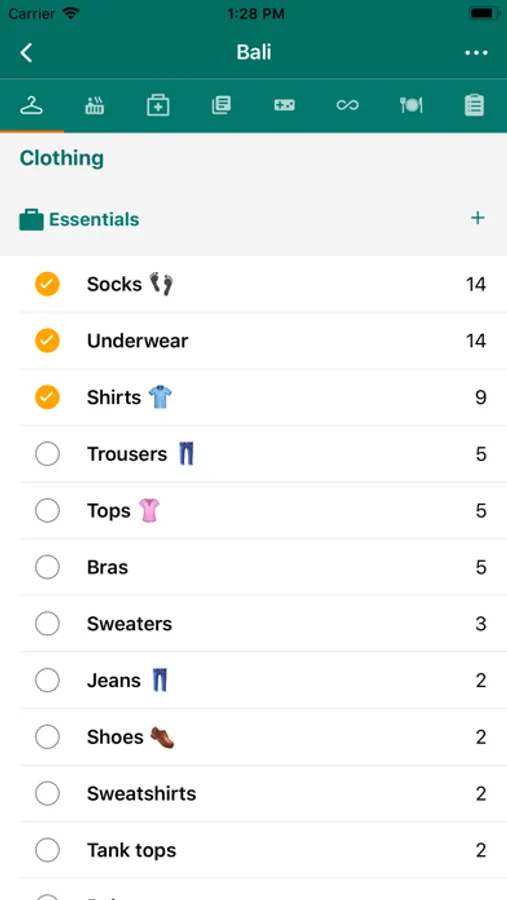 Supported activities of this packing list app are: