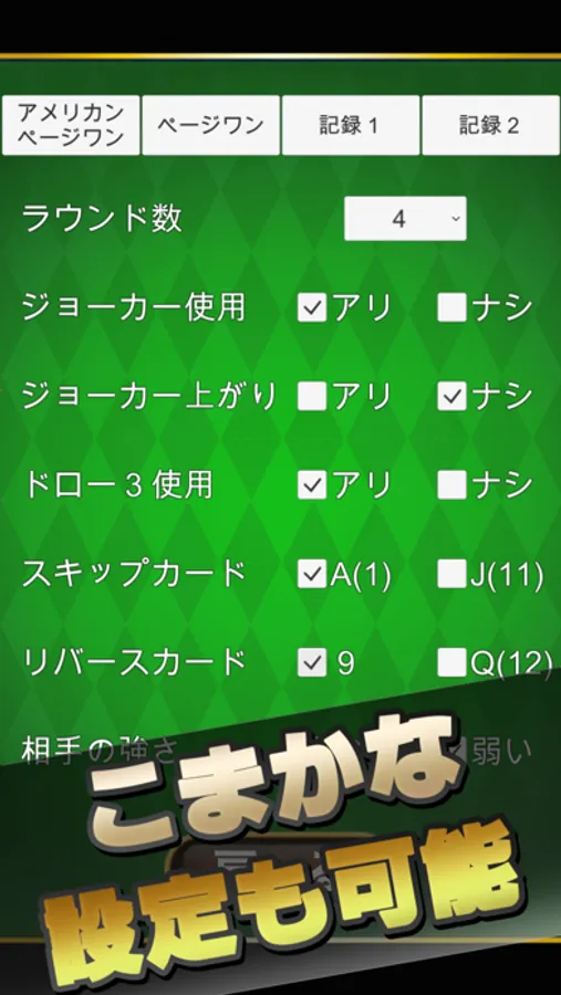 ジョーカーの使用や、カードの「役」の数字割り当てなど、細かな設定が可能です!