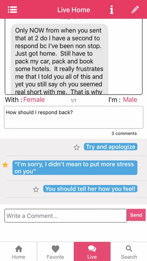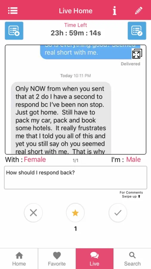 And, that’s not all. Users can visit the LIVE section to get lines and messaging tips in real time from other users. By posting a screenshot of their message conversation and uploading it to the Live Section of the app, other users can comment on the conversation and provide lines and other suggestions. Uploaded screenshots will remain in the LIVE section for 24 hours before they disappear. Press the check to favorite and save the post. Press the "X" to dislike a post. Press the star to leave a like. To comment on a post swipe up. Tap the star next to a comment to save your favorite lines and comments. Ask. Assist. Respond. – as simple as that.