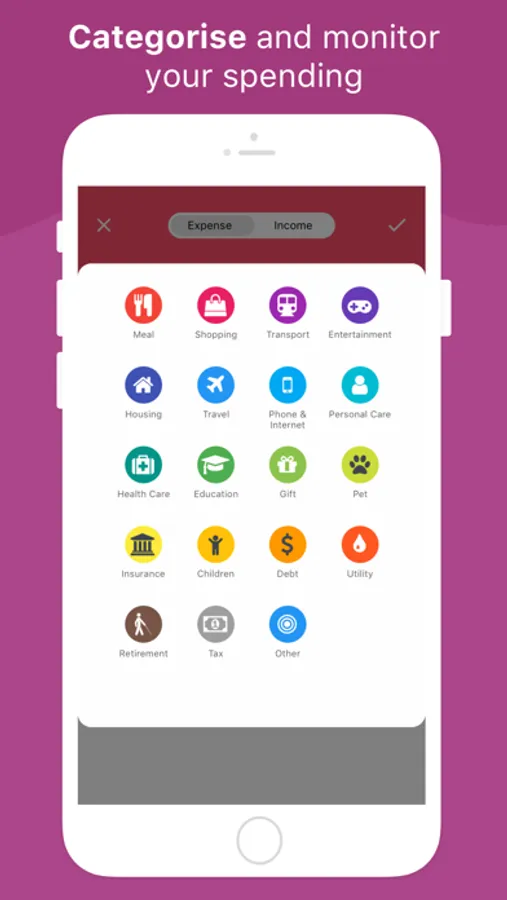 Users are able to log and categorise each entry as either an expense or income; complete with unique icon assigning.