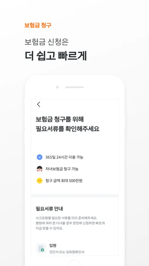 - 영수증 사진만으로 보험금을 빠르게 신청하고 진행상황을 확인할 수 있어요.