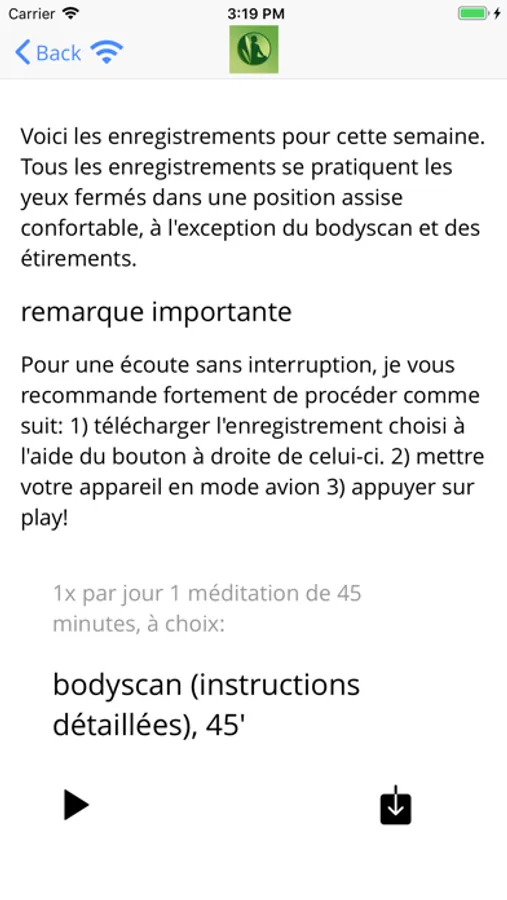 Le meilleur moyen d'écouter les méditations sans être dérangé ni par une coupure de réseau ni par des notifications est de 1) télécharger localement l'enregistrement souhaité à l'aide du bouton à la droite de son nom et 2) mettre l'appareil en mode avion puis 3) appuyer sur play!