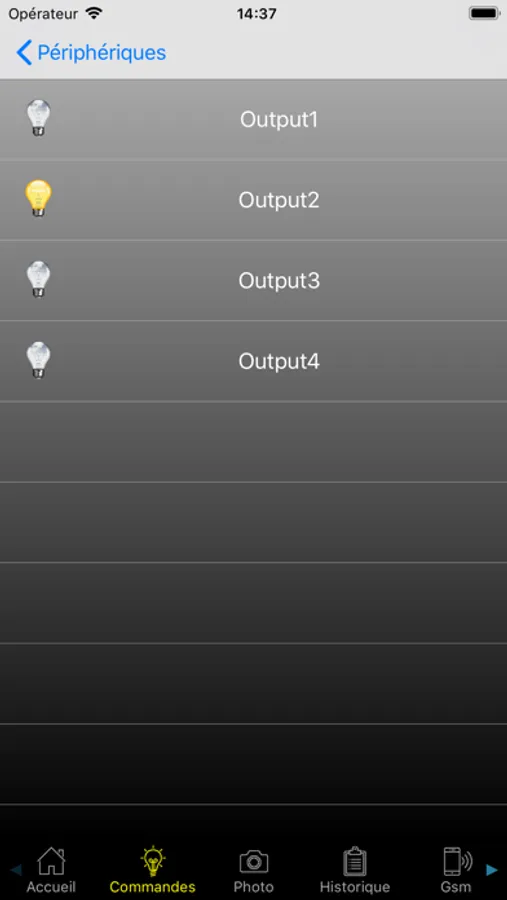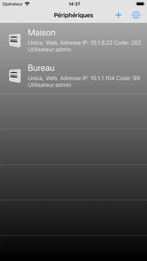 Grâce à cette application, l'utilisateur peut contrôler diverses caractéristiques du système suivant le modèle installé de centrale d'alarmes. L'application permet de contrôler la centrale d'alarmes en mode Cloud, Web ou SMS.