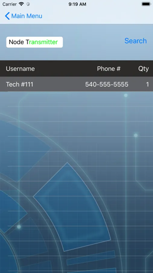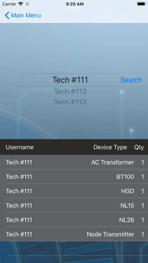 Technicians may also search other technicians' inventories belonging to their area, either by equipment name, or technician name