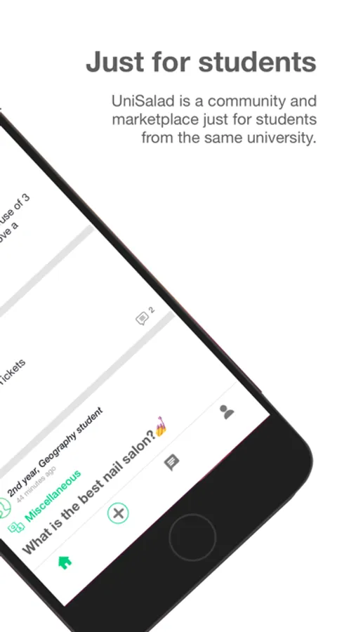 UniSalad is free and exclusive to students from your university. Finally, a platform you can trust, with no fake profiles or non-students, so you can deal with your student needs safely and stay up to date with your student community.