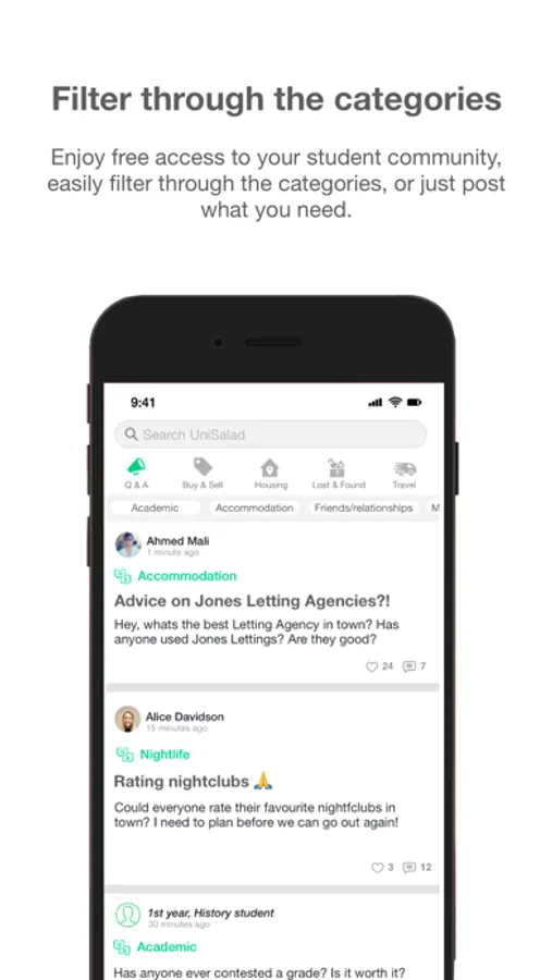 UniSalad is a platform for students to connect with others from the same university, to ask questions, share honest student tips and solve student life needs.