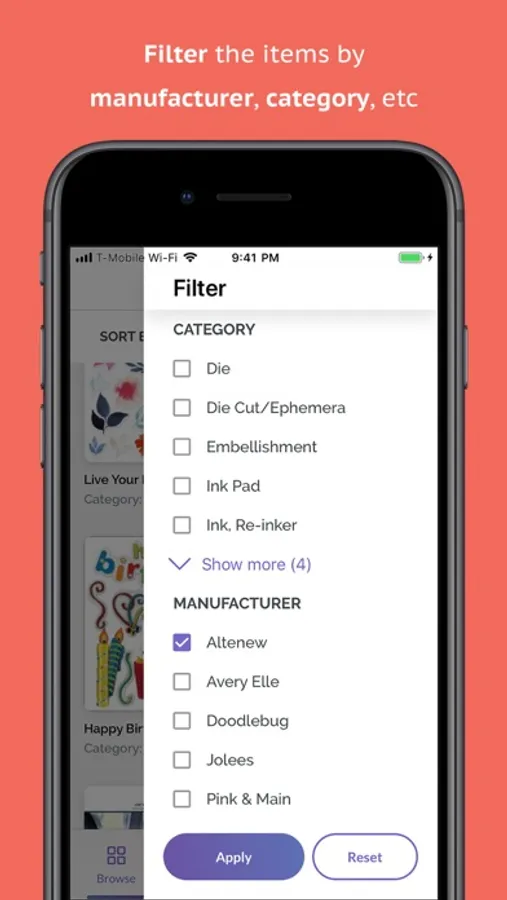 • Searching and Filtering: Find your items by searching for both word and color tags. Use the filtering tool to select a Manufacturer or Category.