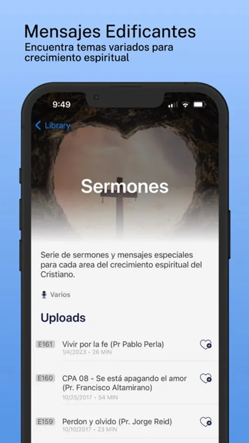 * Accesar librería de programas, sermones, podcast y otros recursos y audios edificantes.