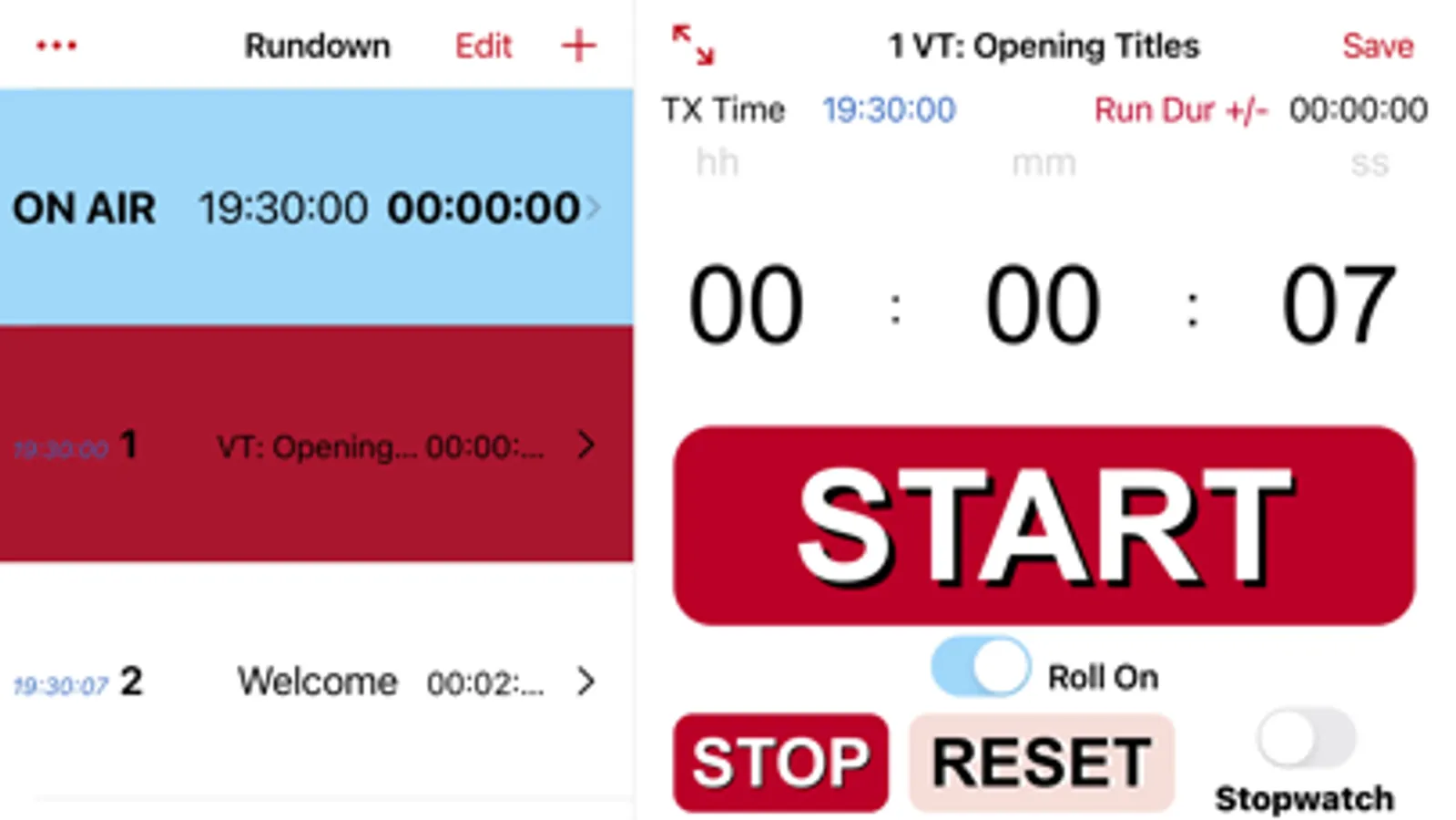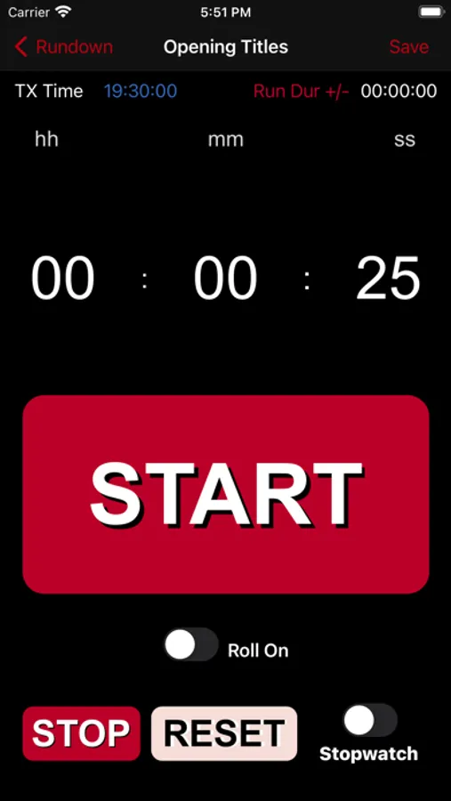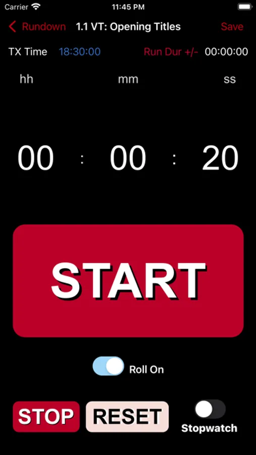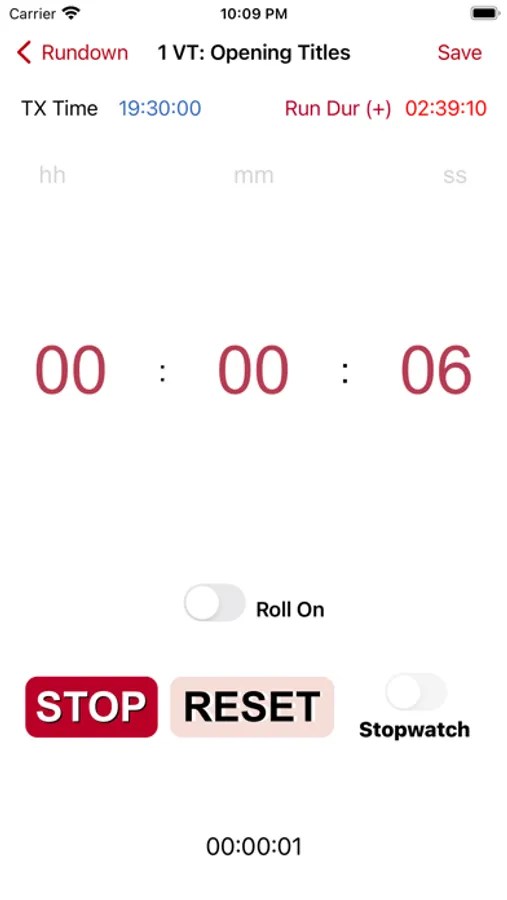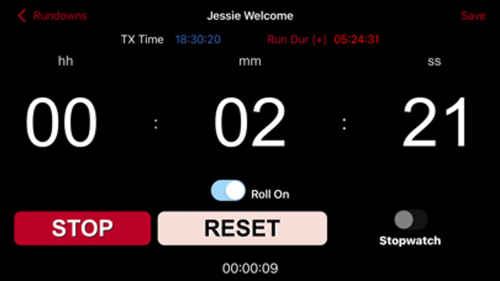 If Roll On slider is on, when the current timer has reached zero, it will automatically continue timing the next item in the rundown. This will continue to the end of your rundown, or until an item has this selected to off. Switchable at anytime.