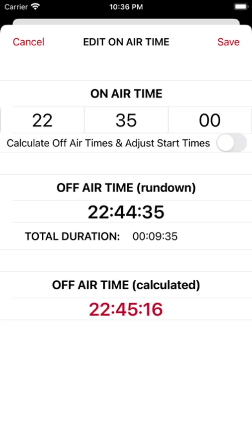 Once you enter your on air time, you can select to automatically calculate the Off Air Times and Adjust each items TX Start times. So if you were to go on air say 45 secs later than scheduled in your rundown, you enter the new on air time and select the switch to automatically calculate, then press save. It will then change your TX start time for each item to reflect your new on air time and calculate your new off air time. If you make changes to item durations, during the show, it will automatically recalculate. You can easily switch this feature off again anytime, if you wish for it to no longer calculate changes.