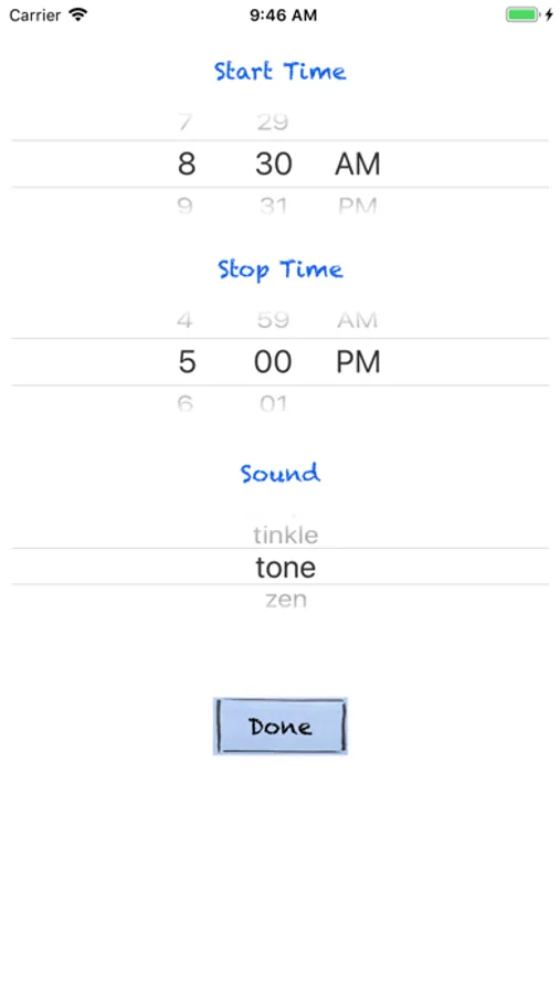 Tap on settings (the blue gear icon) to select the start and stop time for reminders. You can also choose your reminder tone from this screen. You can select multiple tones and these will be allocated to your messages. Using multiple reminder tones helps prevent notification fatigue.