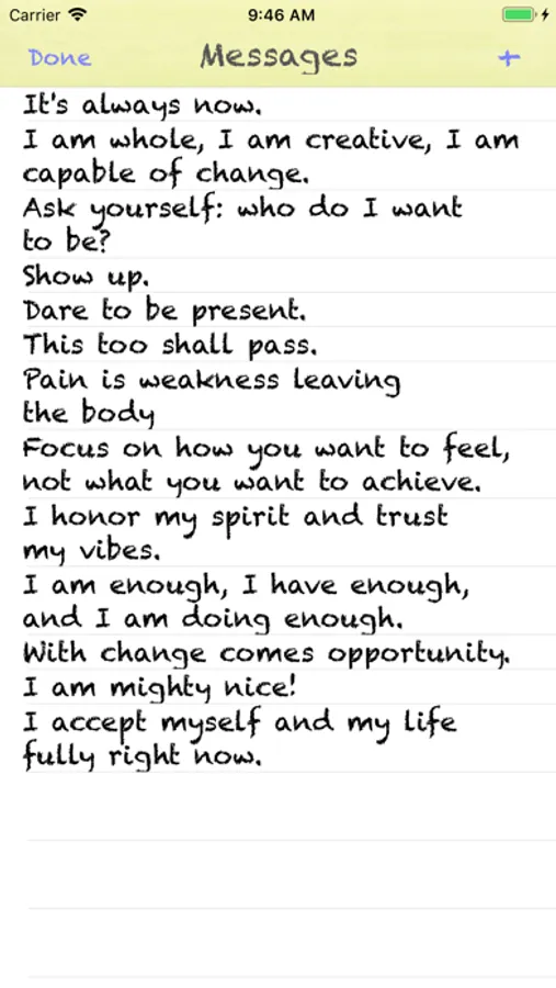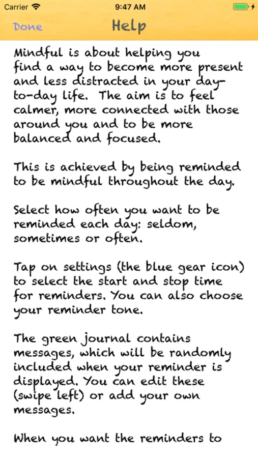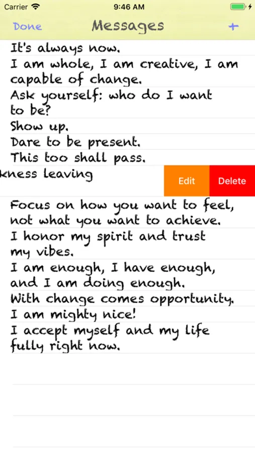 The green journal contains messages, which will be randomly included when your reminder is displayed. You can edit or delete these (swipe left) or add your own messages.